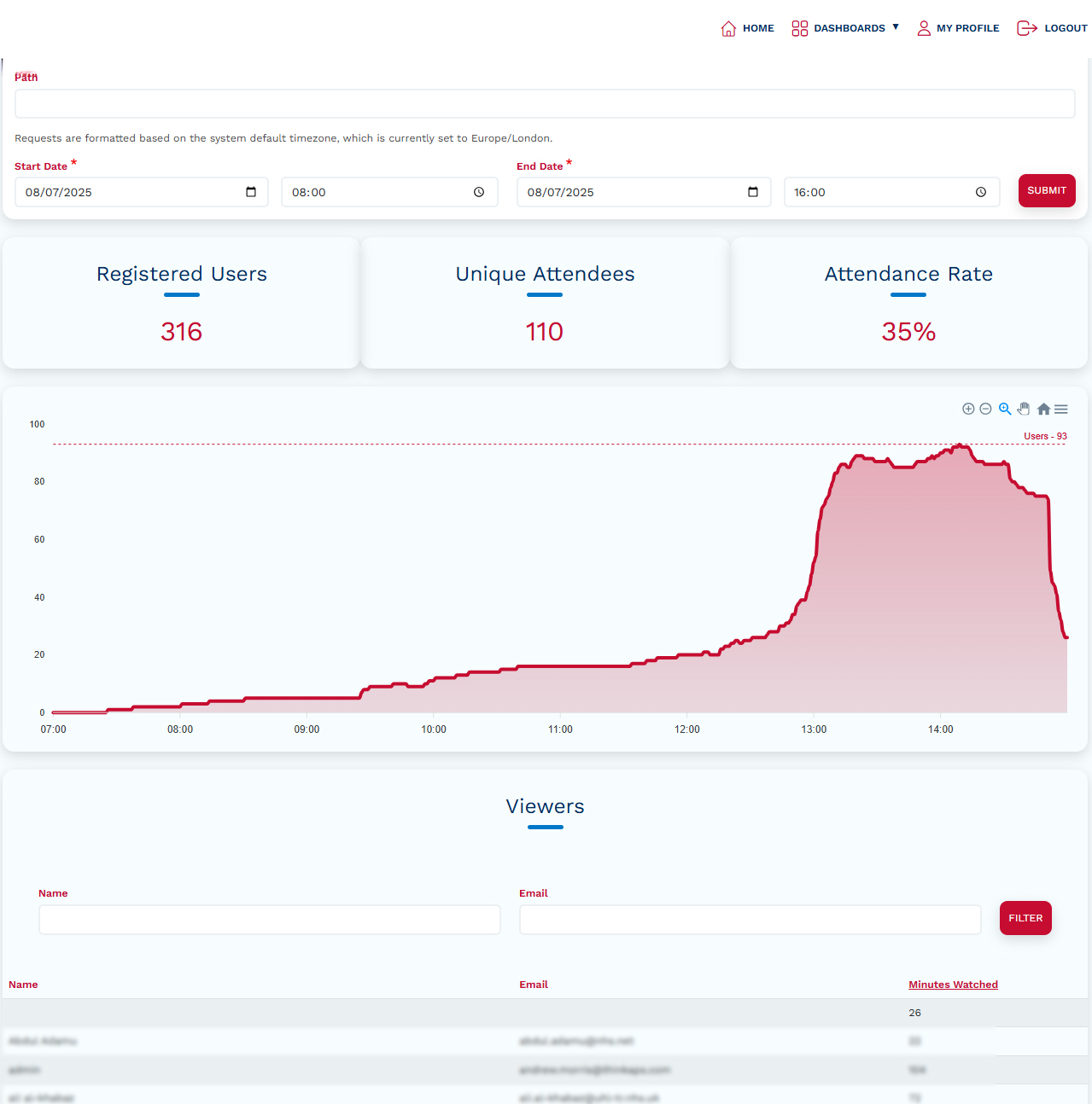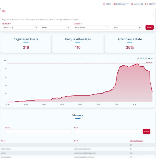 Live event data - Number of users watching live, what they watched and for how long. Including geographical and device metrics.